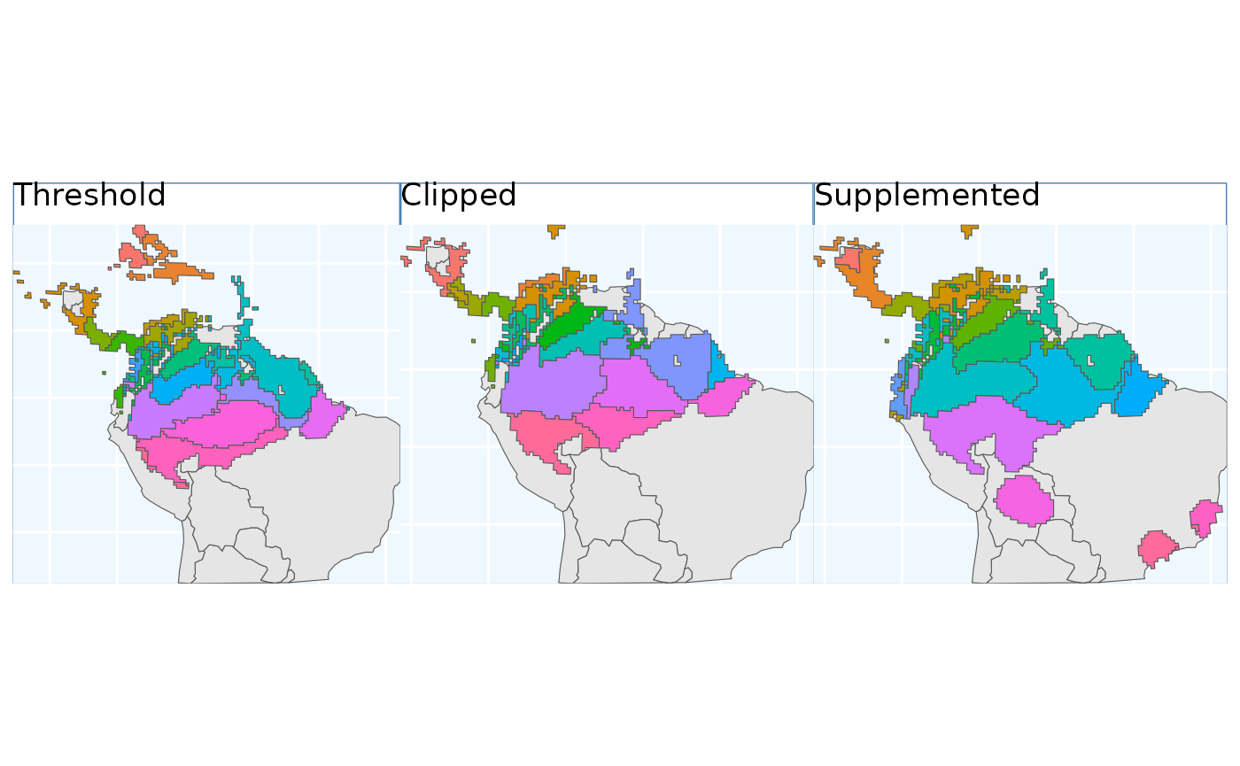 Using the threshold raster surface is a very good option if we do not want to ‘miss’ too many areas, whereas the clipped and supplemented options may be better suited for scenarios where we do not want to draw up clusters, which lack any populations which can be collected from.