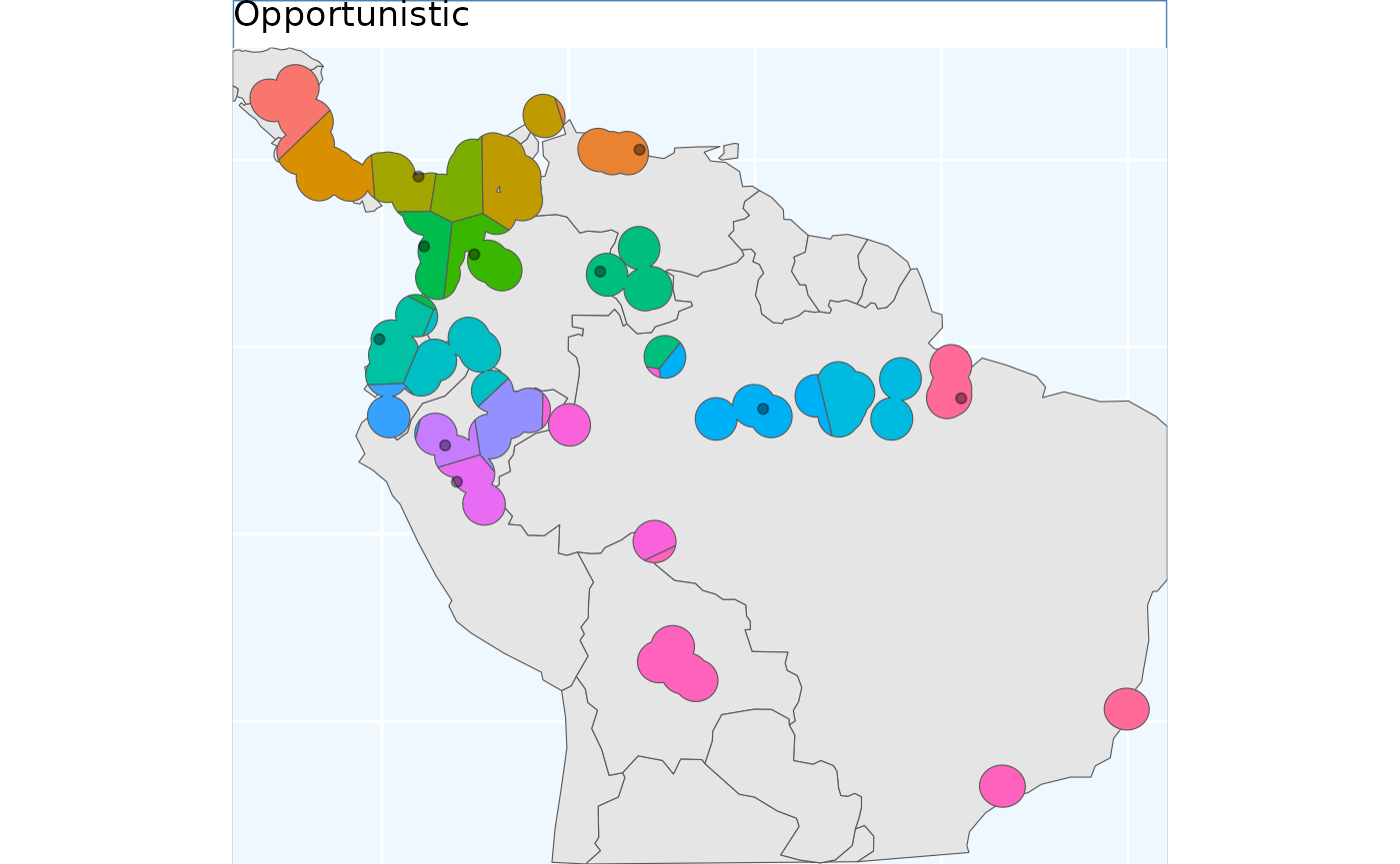 These plots are able to showcase the difference in results depending on which of the three input rasters are utilized. As with all of the sampling schemes, results vary widely based on the spatial extents which the functions are applied to. Using the SDM output which have undergone thresholding results in the largest classified area. At first glance the results may seem very different, but if you look at central america, they are largely consistent, as they are near the Andes; large differences do exist in the Amazon Basin, but even there some alignment between the systems is evident. Accordingly, the surface used for a species should match some evaluation criterion.